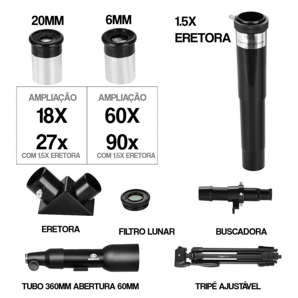 O telescópio refrator azimutal Greika F360 60MM é um equipamento leve de nova geração, compacto, especialmente projetado para permitir que um modelo econômico possa concentrar grande entrada de luz proporcionando assim visualizações celestiais e terrestres de qualidade superior, preservando ainda um excelente fator custo benefício, requerendo ainda pouca manutenção.