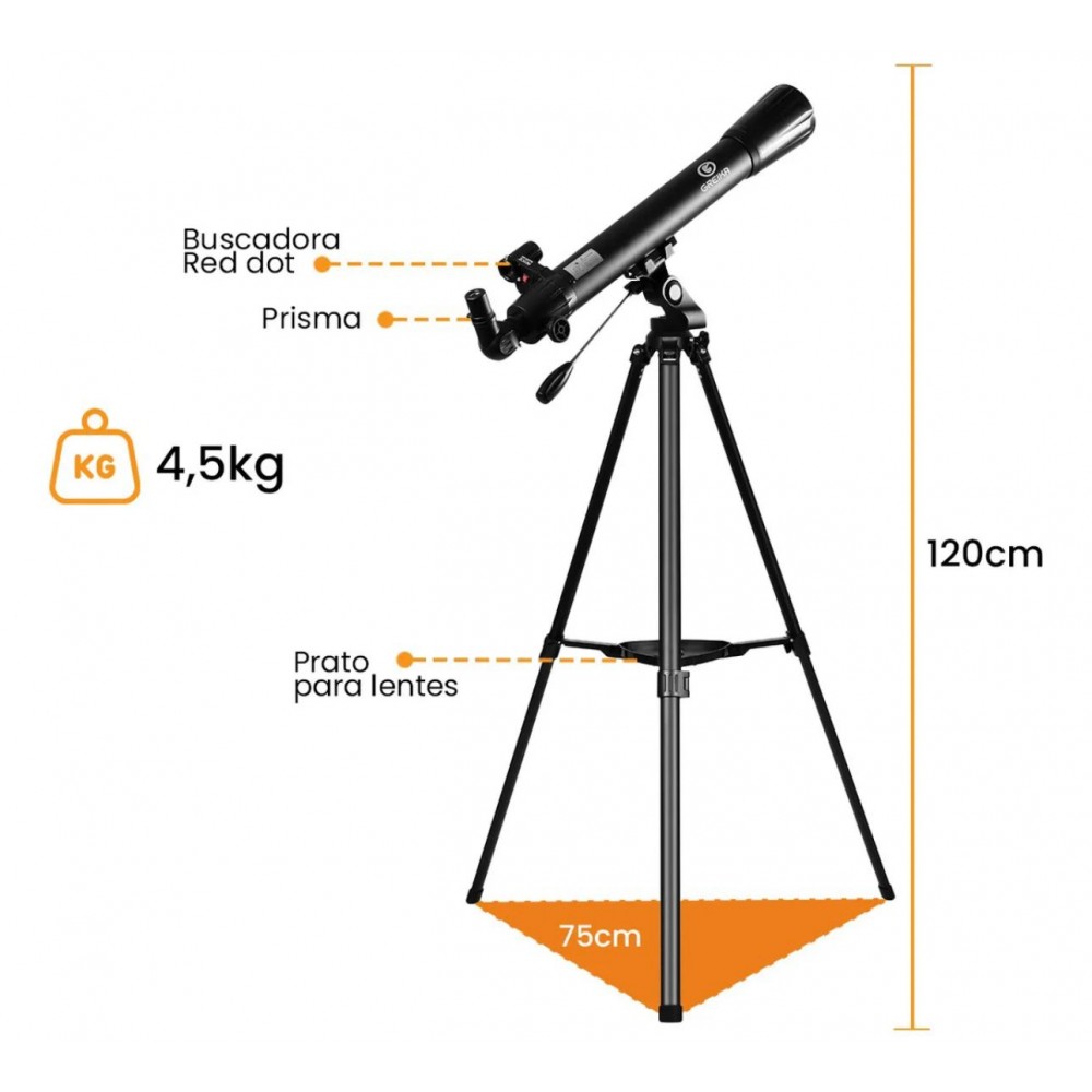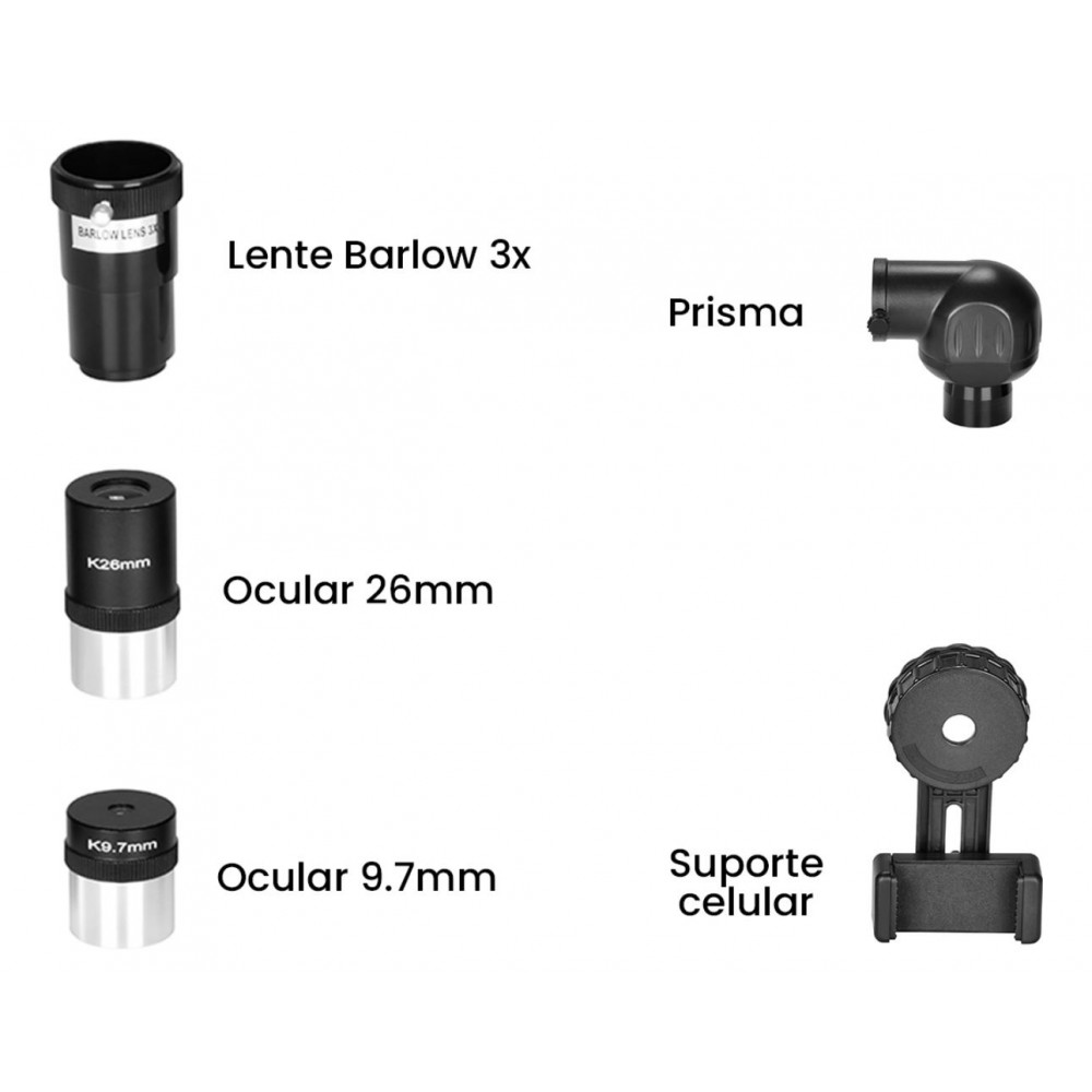 Um telescópio com distância focal de 700 mm, objetiva de 70 mm em cristal ótico de alta precisão e duas lentes (uma de 26 mm e outra de 9,7 mm).