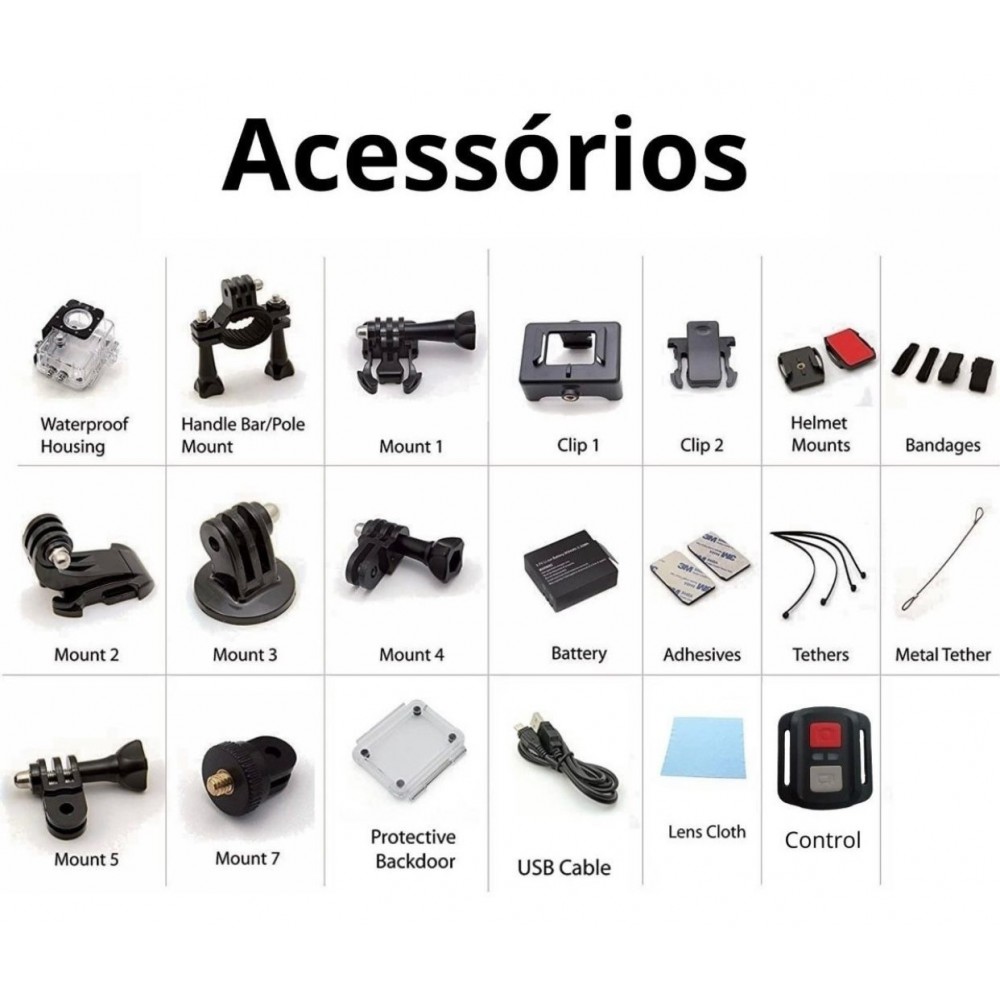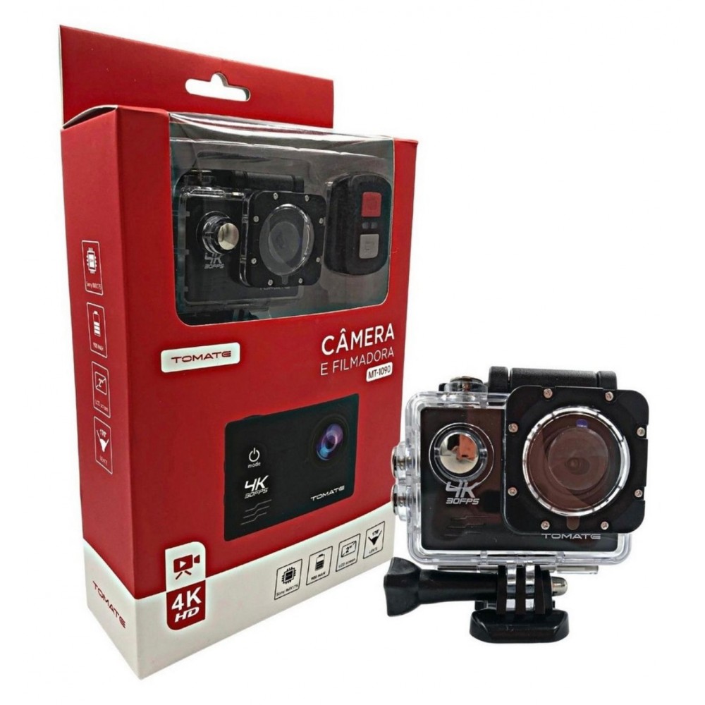A Câmera acompanha uma Case à prova d'água até 30 metros de profundidade. Faça filmagens em todos os tipos de ambientes, seja em terra, água ou ar! O carregador é Bivolt, por isso a bateria pode ser recarregada em qualquer tomada, seja 110V ou 220V.