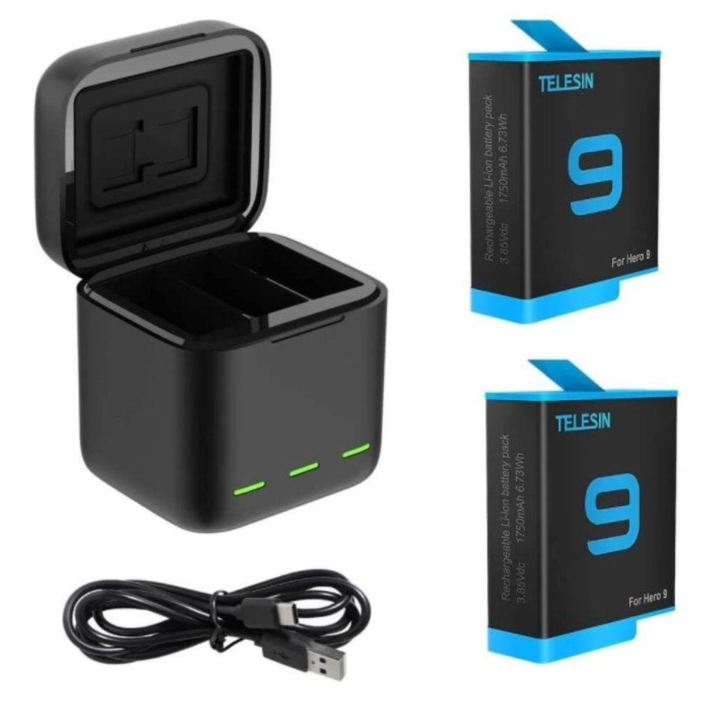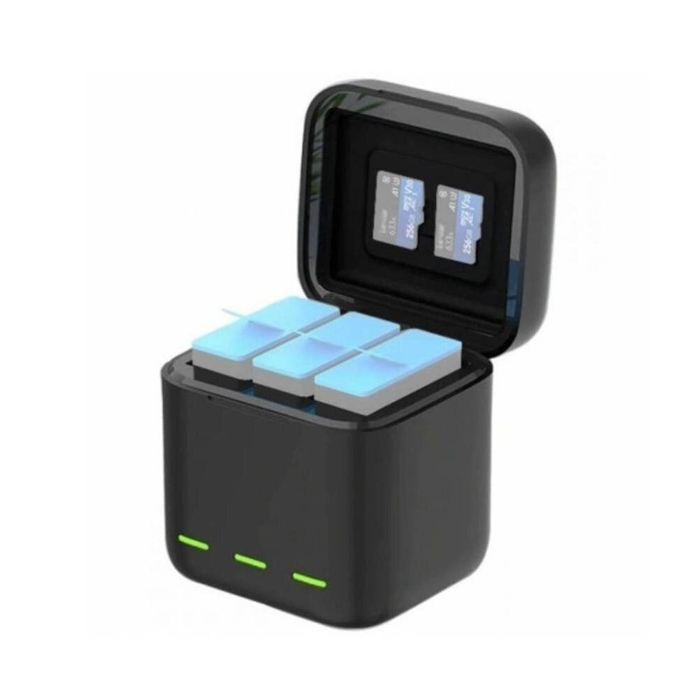 Com este kit da Telesin será muito mais garantido você usar sua GoPro Hero 9 Black por mais tempo! O carregador suporta o carregamento rápido de até 3 baterias simultaneamente, em cerca de 2,5 horas para carregá-las totalmente, deixando sua câmera pronta para uso antes do que você imagina. A caixa está equipada com uma tampa magnética, que serve para proteger as baterias durante o armazenamento, além de possuir dois slots para guardar cartões de memória na parte interna.