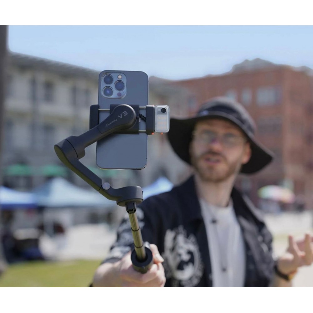Luz de preenchimento magnético para iluminação perfeita: o gimbal para iPhone com luz de preenchimento magnético oferece opções de luz fria, quente e natural, garantindo fotos brilhantes e bonitas mesmo em ambientes escuros. O gimbal iSteady V3 apresenta um novo design de roda lateral para ajuste de brilho suave de 4% a 100%, melhorando a eficiência de disparo. Perfeito para fotógrafos de rua noturnos e vloggers que precisam de iluminação consistente.
