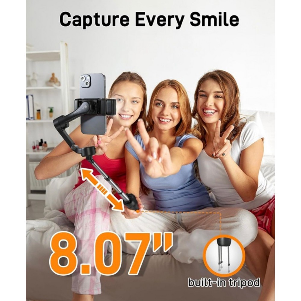 [Haste extensível e tripé para ângulos criativos] O estabilizador cardan para smartphone vem equipado com uma haste extensível e tripé integrados. A haste extensível pode esticar até 20 cm, permitindo que você capture selfies sem esforço, fotos exclusivas de baixo ângulo de animais de estimação ou simule perspectivas aéreas.