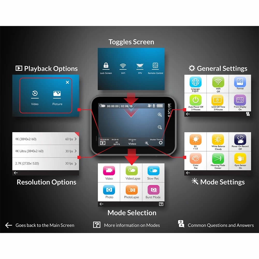 • Super suave: estabilização do giroscópio • Corpo à prova d'água: até 10m • Transmissão ao vivo • Carregamento sem fio • Gravação de vídeo 4K 60FPS • Tela IPS de 2,33 polegadas • bateria de 1300mAh