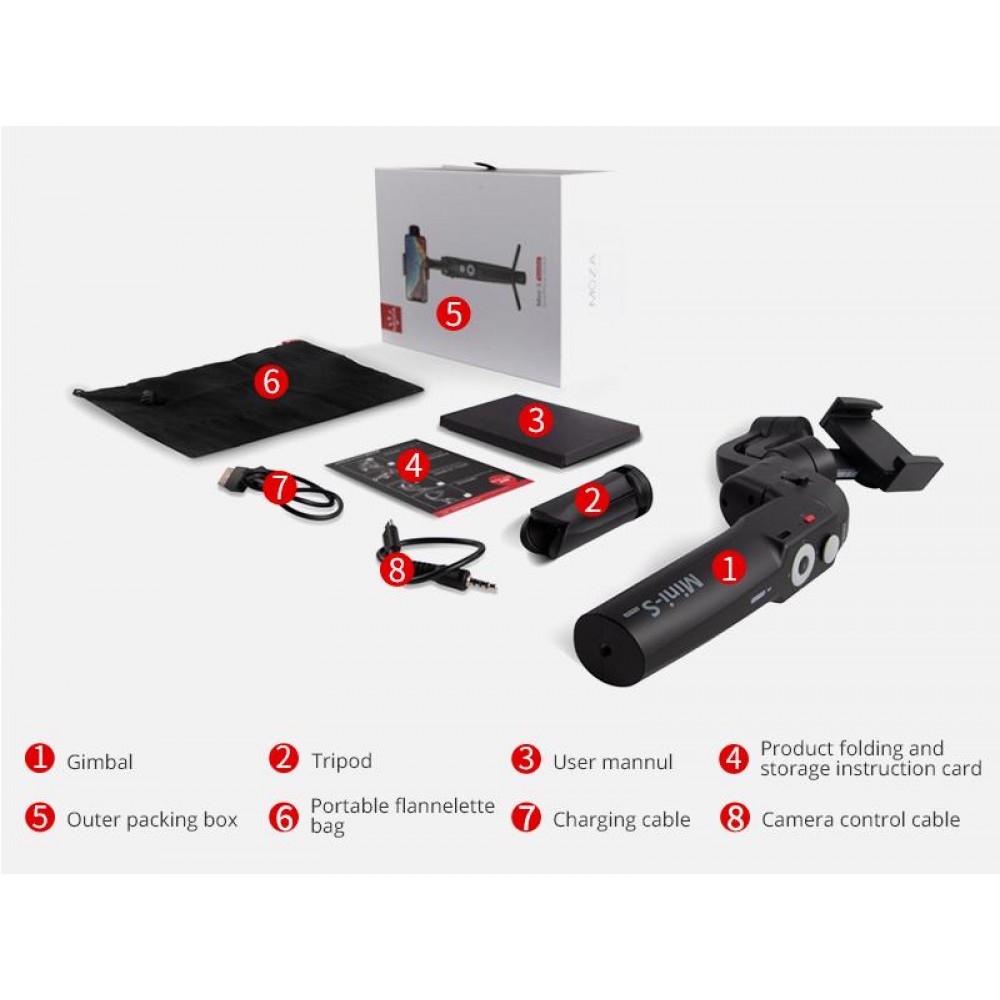 Conecte o Estabilizador Eletrônico Moza Mini-S Essential Gimbal ao aplicativo para SmartPhone APP Moza Genie para download para controle criativo da câmera com tela sensível ao toque. Um cabo micro-USB, cabo de controle da câmera, mini tripé e bolsa de transporte estão incluídos no Kit do Estabilizador Mini-S Essential Smartphone Gimbal.
