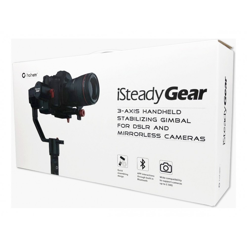 O aplicativo intuitivo inspira sua criatividade: joystick virtual integrado para controlar o ângulo de captura. O iSteady Gear recordará as suas configurações pessoais e repetirá as mesmas imagens em movimento repetidas vezes Carga máxima até 2.5kg (5.51 lbs), compatível com as principais marcas DSLRS e Mirrorless Algoritmo de atitude desenvolvido de forma independente, otimizado sistema de imagem estabilizadora toque na tela para zoom, tirar foto / vídeo 2 x 18650 bateria recarregável de iões de lítio oferecem 12 horas de autonomia Tamanho da câmera suportada: a distância horizontal máxima entre o centro de gravidade da câmera e o eixo de rolagem é 115mm, a distância máxima entre o furo de 1/4 do parafuso e o motor de inclinação é 96mm, a distância máxima entre o centro de gravidade da câmera e placa de liberação é 52mm