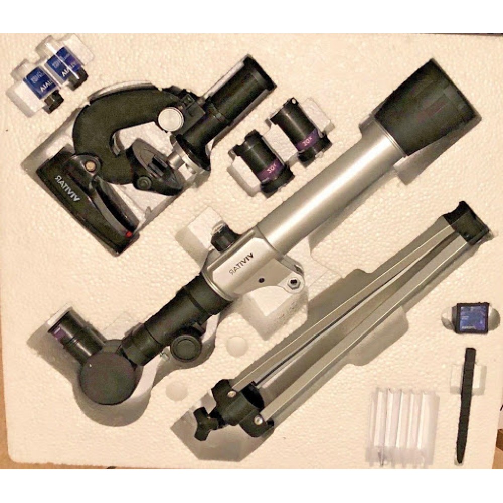 Kit telescópio e microscópio VIVITAR modelo VIVTELMIC20. Telescópio de refração com ampliação de 20 x/30x/40x e lente com 50mm, possui bússola com pontos cardeais para orientação direcional.