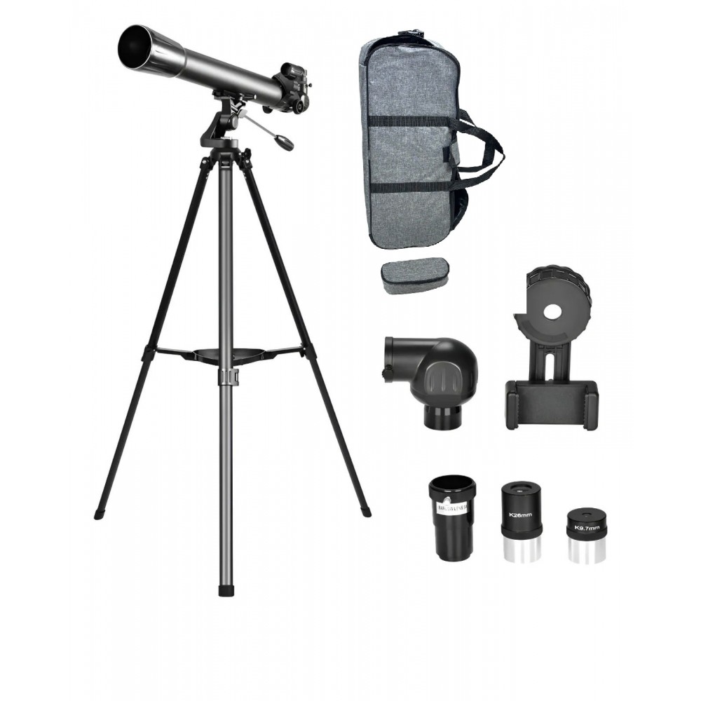 Um telescópio com distância focal de 700 mm, objetiva de 70 mm em cristal ótico de alta precisão e duas lentes (uma de 26 mm e outra de 9,7 mm).
