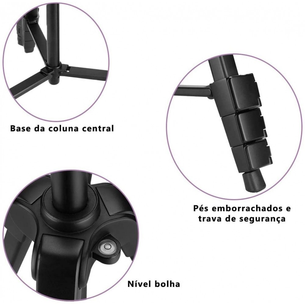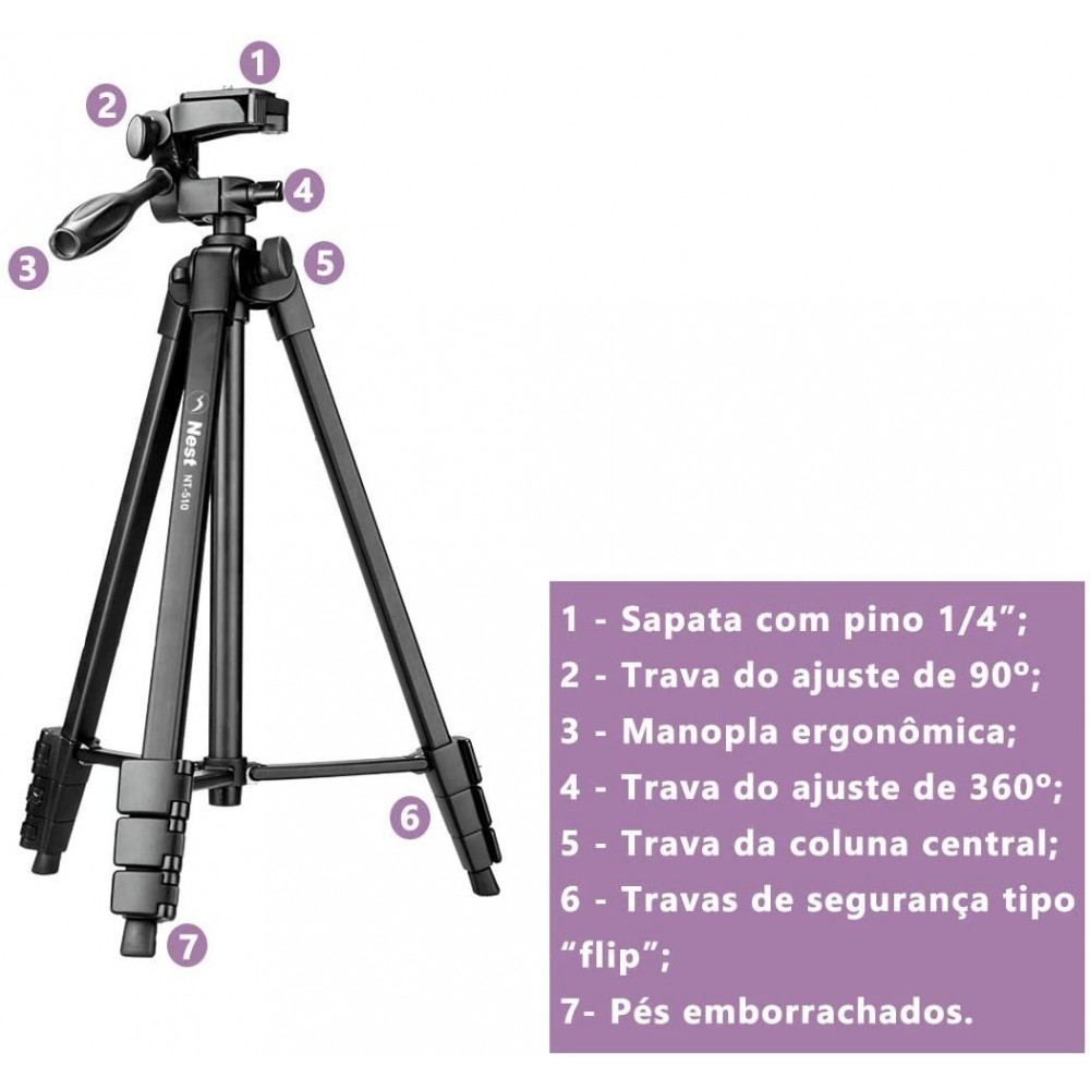 Descrição- O tripé Nest NT-530, é feito de alumínio, é leve e portátil, com apenas 0,64kg de peso, indicado para vários ambientes de filmagens, como dentro de casa, estúdios ou ao ar livre. É adequado para celulares, iluminação, mini projetores e muito mais. É um ótimo parceiro para tirar fotos, transmitir ao vivo, criar vídeos caseiros e estudar.